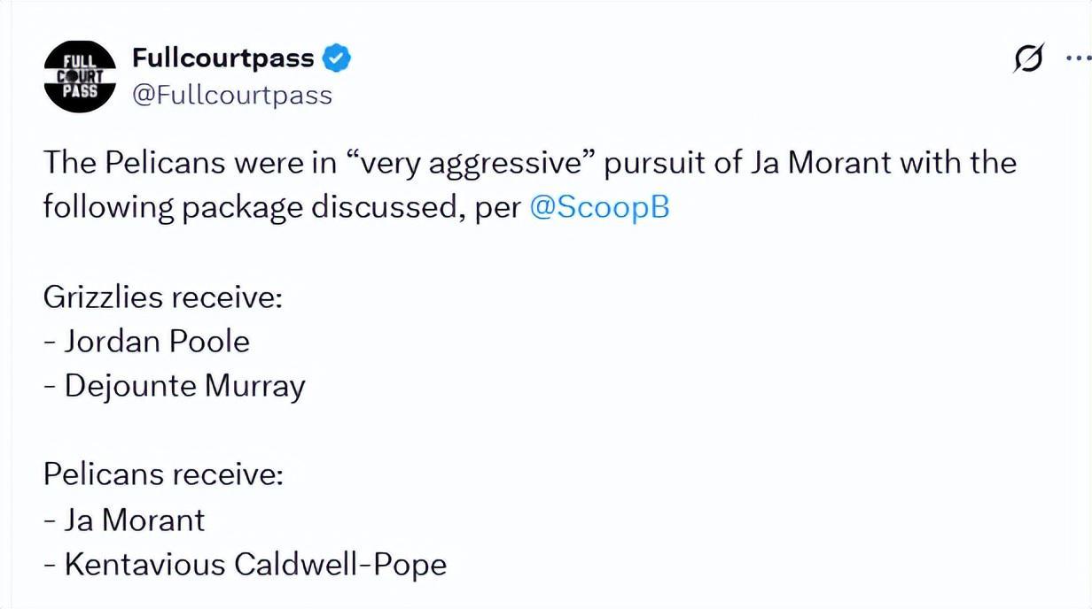 北京时间1月26日,据NBA记者布兰登-罗宾逊报道,鹈鹕非常积极追求灰熊球星莫兰特,并与灰熊讨论了多个交易方案。罗宾逊表示,这是一笔孤注一掷的豪赌。鹈鹕若能将莫兰特纳入阵中,与锡安联手,鹈鹕队瞬间就能跻身全联盟 “最具收视吸引力” 的球队之列。但鹈鹕的野心不止于此,他们还抛出了多套不同的交易方案,试探灰熊队是否会为阵容深度和老将经验动心。据罗宾逊透露,双方讨...